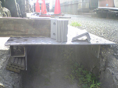 現地で既設構造物形状にあわせ裏面に滑り止めアングルを溶接。