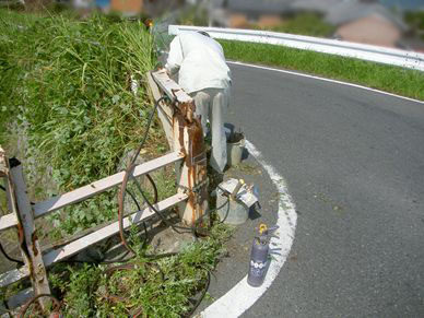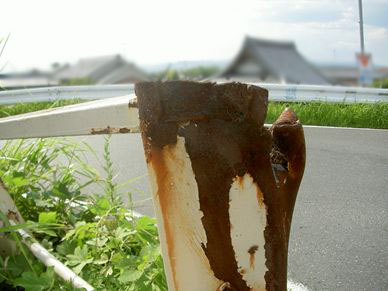 15cm角、結構な肉厚の支柱がここまで拉げるとは、どういうぶつかり方をしたのだろうか? 当該道路は道幅が狭いが通行量が多く、大型車もよく通っているようだ。曲がる時に巻き込んだのかもしれない。 当然作業中は交通誘導員を配置していたが、曲がるスペースを確保する為、作業を中断することがしばしばあった。 溶接がとれているだけの箇所を再溶接、拉げてどうにもならない箇所をガスで切断して取り除く。 切断したところに、新たに鉄板を溶接。 そして全体をケレン(錆落とし)してから塗装し、念の為モルタル巻をして完了。 見た目は悪いが、最低限の機能は回復した。 |